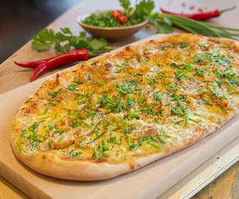 Food & BeverageMarché Food Lovers' Place Teriyaki pizza with chicken in teriyaki marinade, black sesame seeds and chives