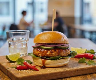 Food & BeverageMarché Food Lovers' Place Asian burger with pak choi, turkey in teriyaki marinade, wasabi and red onions